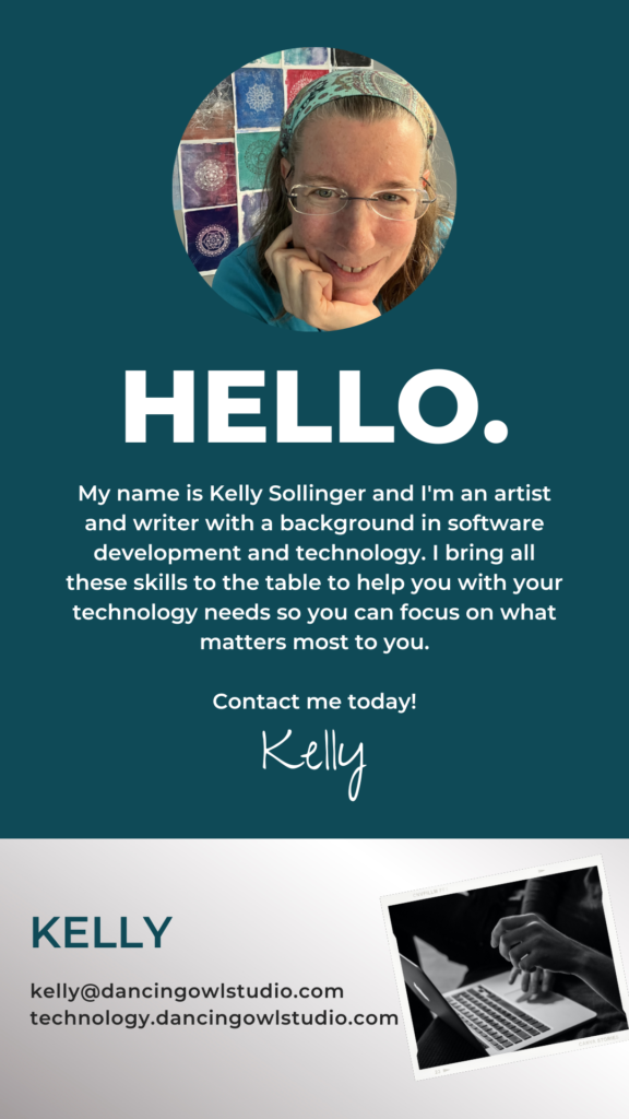 That’s where Dancing Owl Studio comes in! I can help you create a simple web presence to define who you are and what you do. I can help hook it up to your social media platforms. And I can advise you on all the technology questions you have.